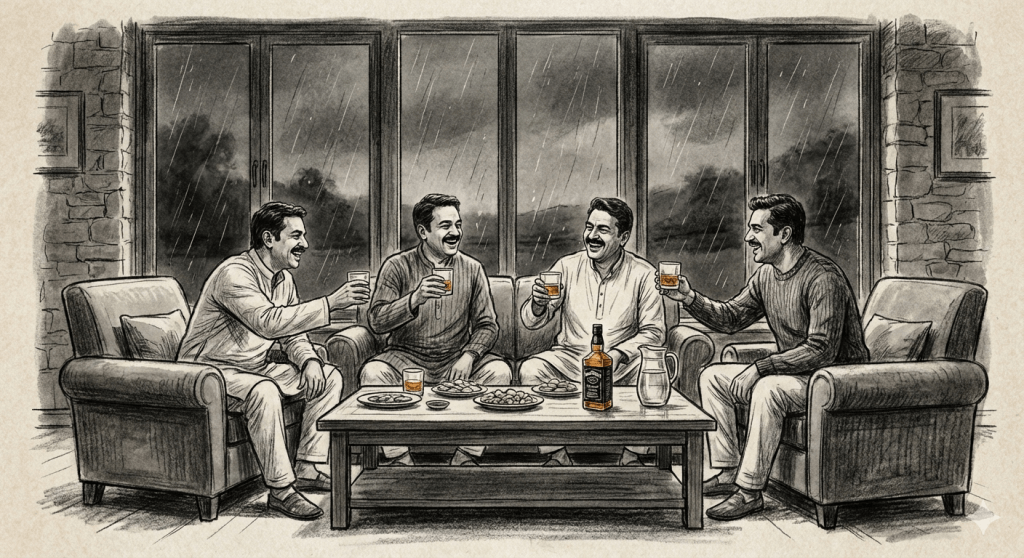 ढाब्यावर दारूसोबतचे स्नॅक्स, डिनरला बटर चिकन, नान, बिर्याणी, अशी भली मोठी ऑर्डरच त्यांनी दिली. सगळं काही एका तासात जयूच्या बंगल्यावर पाठवण्याचं मालकानं मान्य केलं आणि गाडी मार्गस्थ झाली. बऱ्याच काळानंतर त्या चौघांचा योग जुळून आला होता आणि मुख्य म्हणजे प्रत्येकाला घरून परवानगी सुद्धा मिळाली होती.